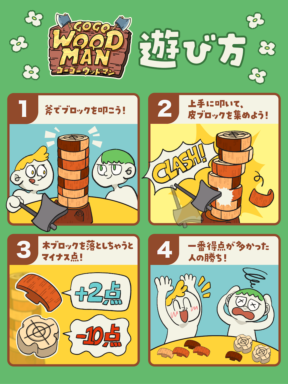 発売日 2025年8月8日ゴーゴーウッドマンはオノでブロックを叩いて落とすアクションゲーム!オノで上手に木を叩いて、木の皮だけを落として集めよう!ゲーム終了時に最も多くの点を集めたプレイヤーの勝利です。ただし木を倒してしまうと大きなマイナス点となってしまうので気をつけて!